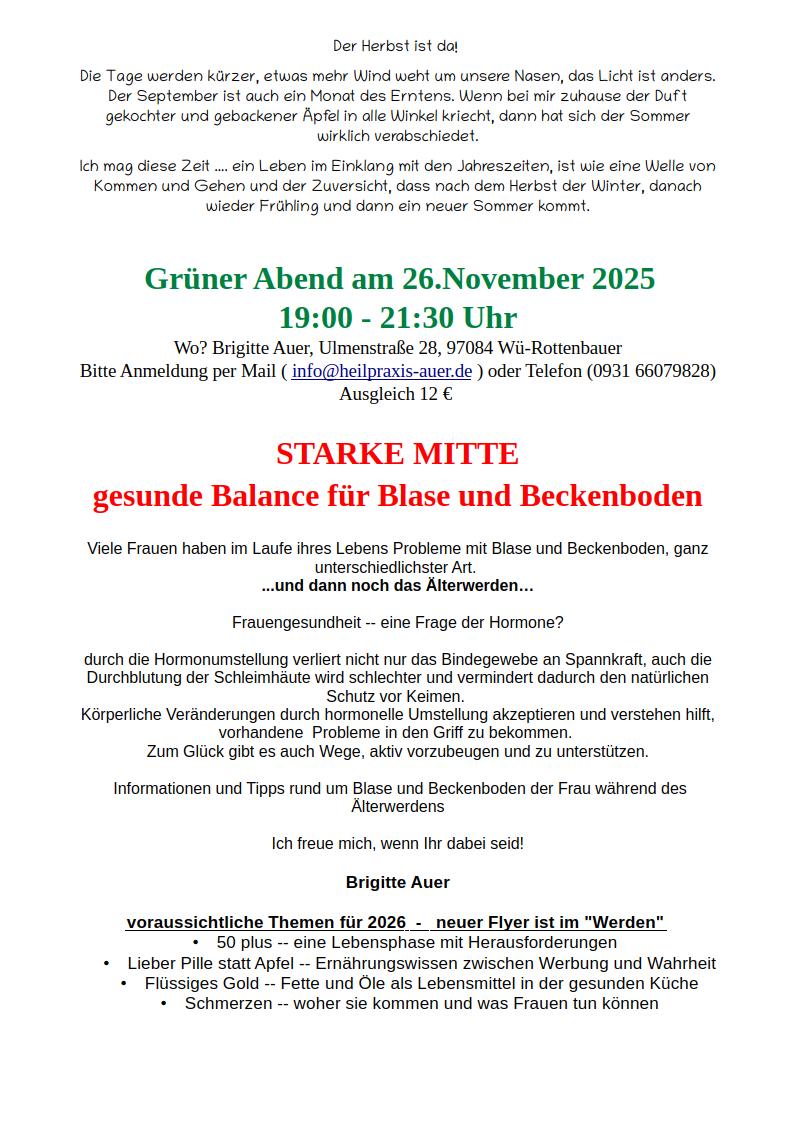 Über aktuelle Termine informiere ich Sie auch gerne persönlich nach Kontaktaufnahme per Mail an info@heilpraxis-auer.de